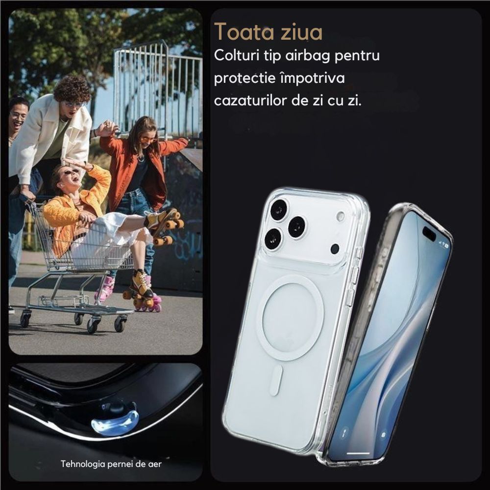 Fabricată din TPU + policarbonat de înaltă calitate, această husă rezistă la șocuri, zgârieturi și uzură zilnică, păstrând în același timp claritatea cristalină. Magnetul MagSafe integrat asigură o prindere perfectă și compatibilitate cu toate accesoriile MagSafe — încărcătoare wireless, baterii externe, suporturi auto etc.